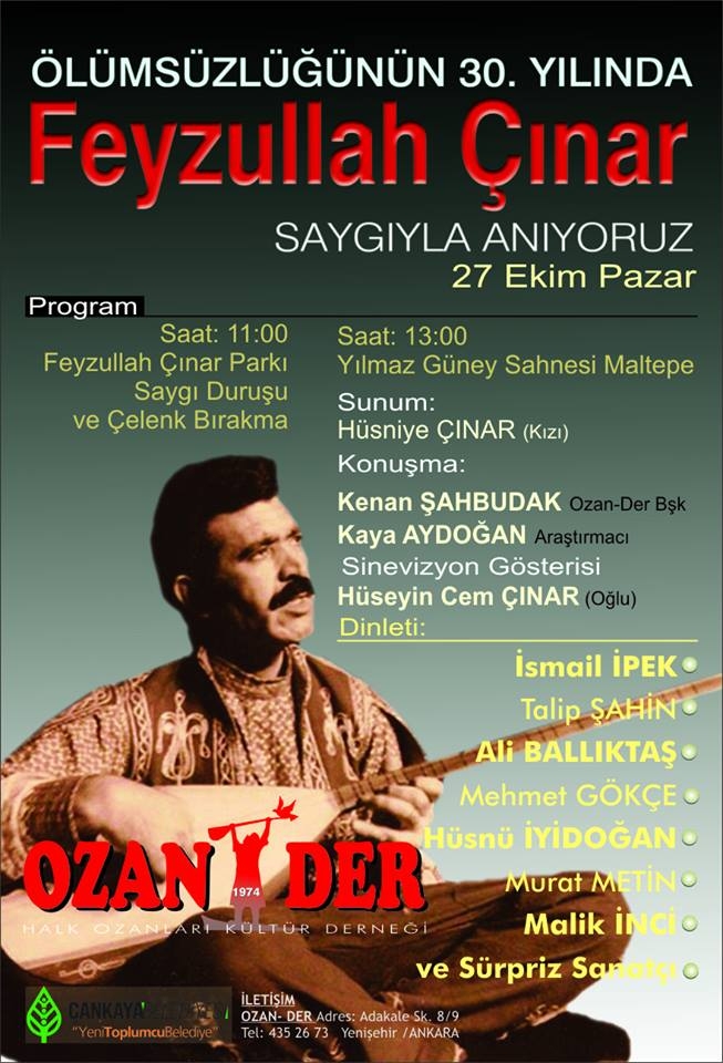 Ozanlık geleneğinin unutulmaz isimlerinden olan Halk Ozanı Feyzullah Çınar aramızdan ayrılışının 30. Yılında Merkezi Ankara’da bulunan OZAN-DER tarafından düzenlenen anma etkiliğinde anılacak.